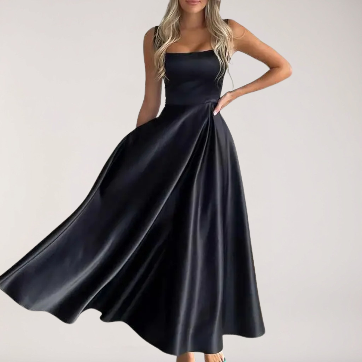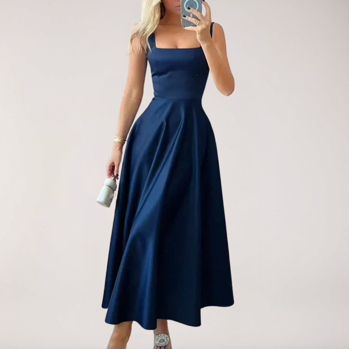 تقدم هذه الفستان الميدي شكلًا هيكليًا مع ياقة مربعة تبرز الجمال. تصميمها على شكل A-line يوفر أناقة راقية للمناسبات الرسمية.