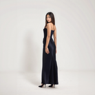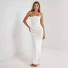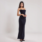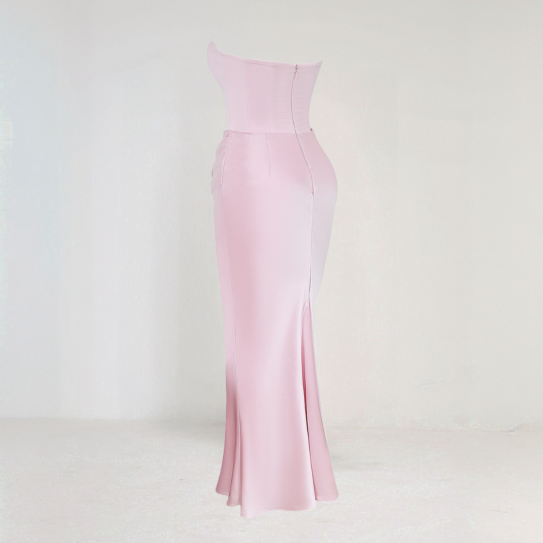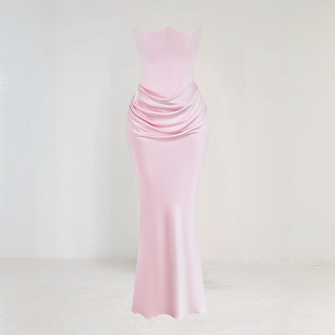 تُبرز هذه الفستان الكورسيه الأنيق القوام بفضل الجزء العلوي الهيكلي. تصميمه بدون حمالات وقصته السائلة تضيف لمسة من الرقي الطبيعي. مثالي للمناسبات الرسمية والسهرات الأنيقة.