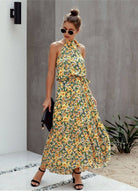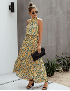 هذا الفستان الطويل البوهيمي يجذب الأنظار بطبعه الزهري المتألق ورابطه الأنيق الذي يمكن ربطه حول العنق. قصته الانسيابية تبرز القوام بشكل رقيق بينما توفر راحة مثالية لأيام الصيف الحارة. مثالي لهروب صيفي أو نزهة في المدينة.