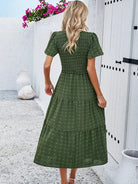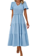 هذه الفستان البوهيمي الأنيق بأكمام قصيرة مثالي لمظهر يجمع بين الراحة والأناقة. يبرز خصره المطاطي شكل الجسم، بينما يضمن تصميمه السلس راحة قصوى. مثالي للصيف، والخروجات، أو الأيام المشمسة.