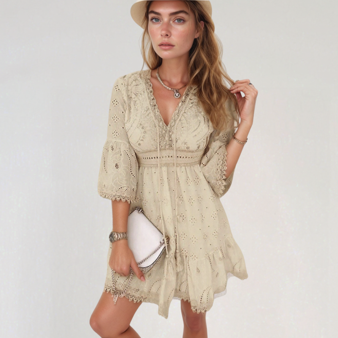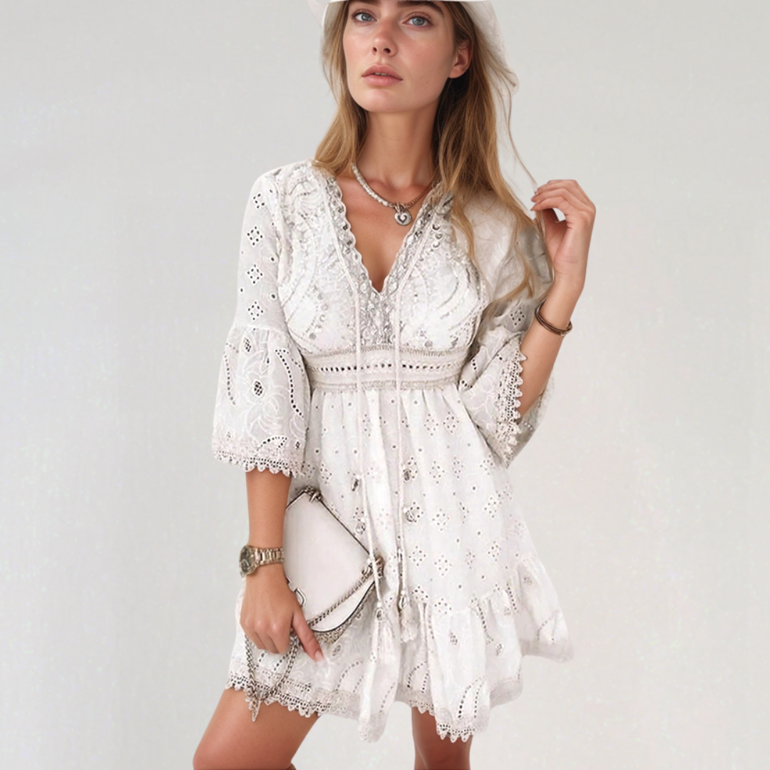 Ghislaine | Krátká bohémská šaty – Jemné výšivky a límec V