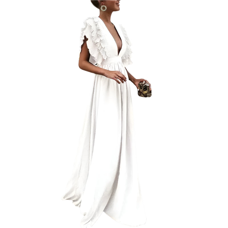 Louise | Elegantní dlouhá šaty s volány a hlubokým výstřihem
