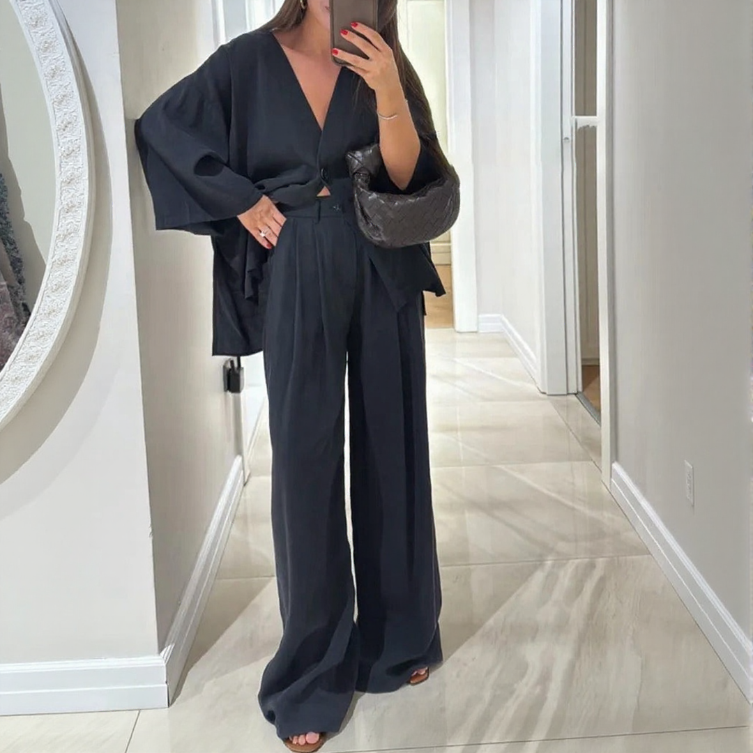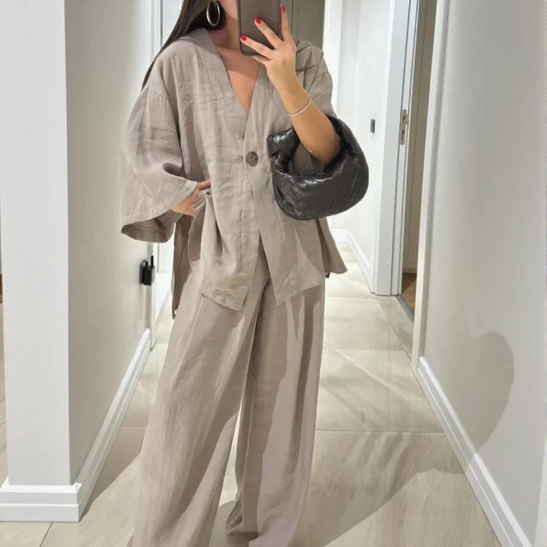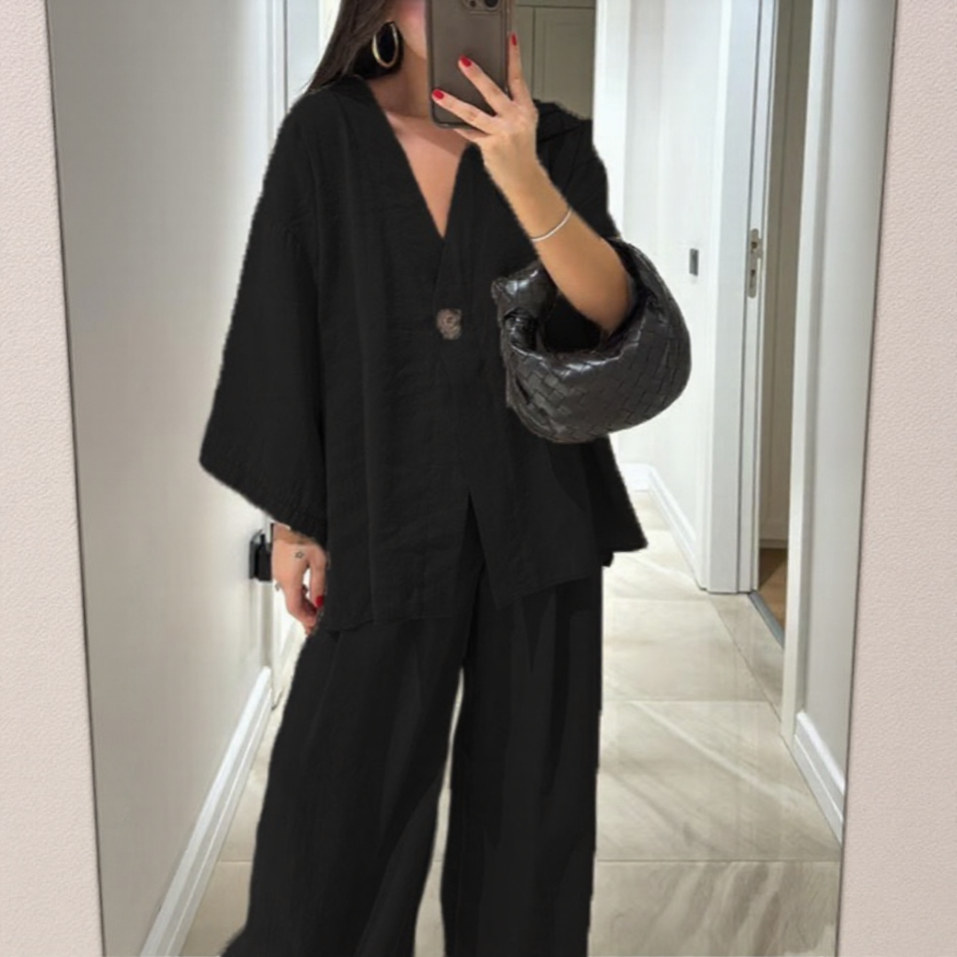 Tento set spojuje vzdušnou tuniku s širokými kalhotami pro elegantní siluetu. Navržen tak, aby poskytoval optimální volnost pohybu, je ideální pro horké dny. Perfektní pro neformální výlety nebo chvíle odpočinku doma.