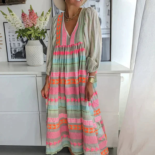 Denne kjole med lange ærmer har en flatterende pasform, der fremhæver silhuetten. Dens sommerlige og trendy design passer både til afslappede udflugter og mere formelle lejligheder. Et uundgåeligt stykke til et friskt og feminint look.