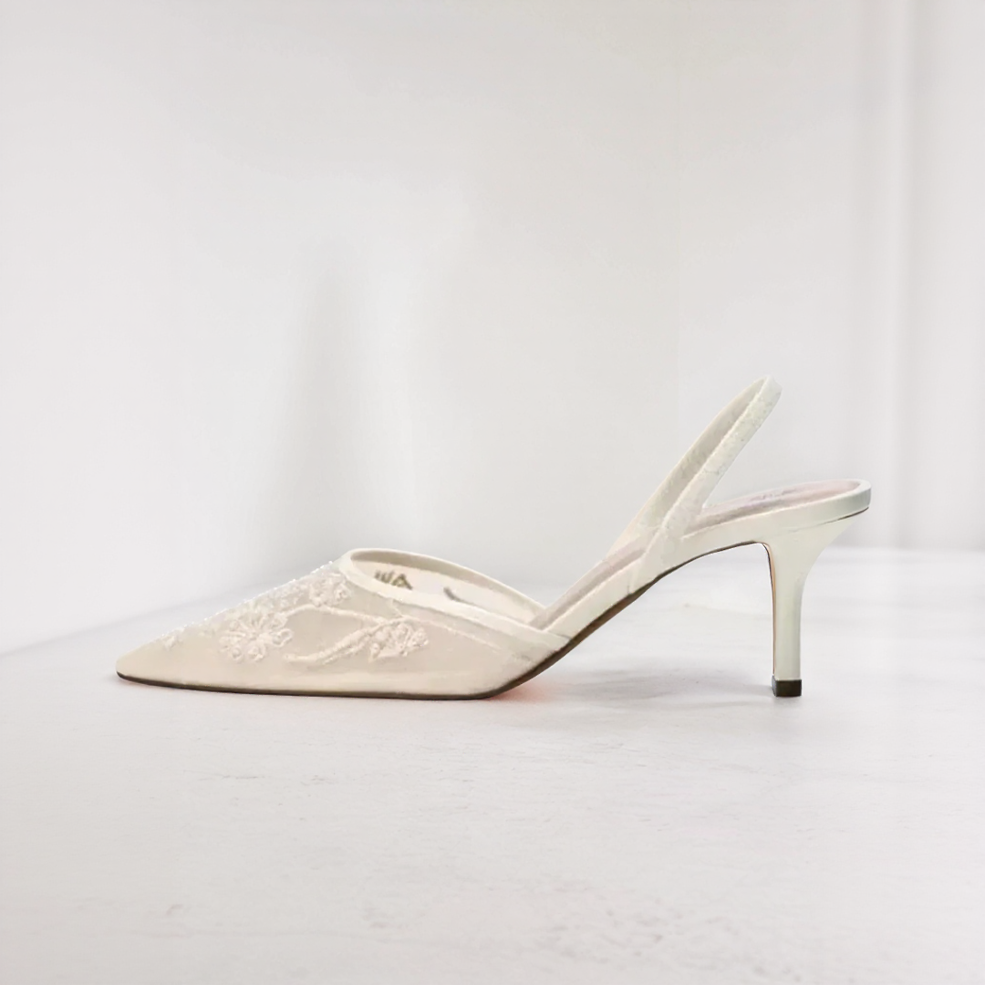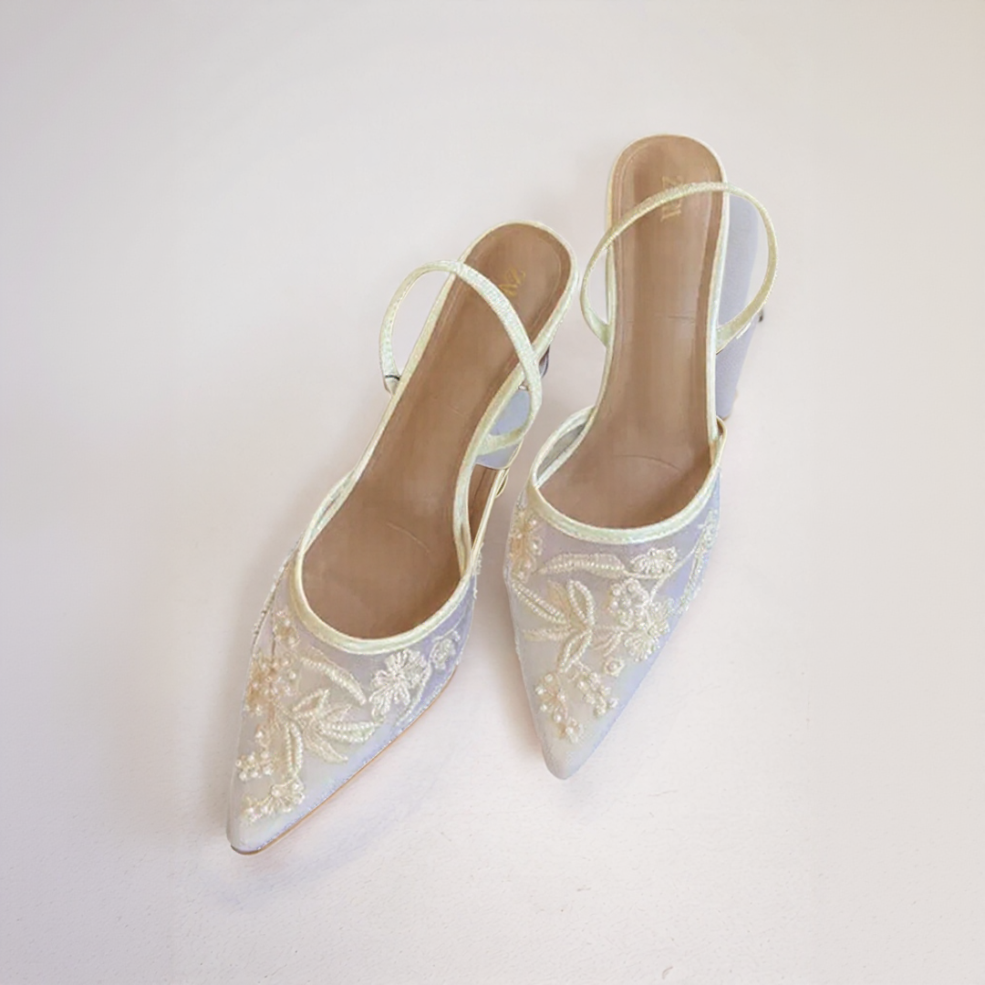Estos zapatos de tacón se destacan por un delicado bordado floral sobre una parte superior sólida, ligera y transparente. Su punta afilada alarga la silueta con elegancia, mientras que la correa ajustada asegura un soporte seguro al tiempo que aporta un toque de refinamiento.
