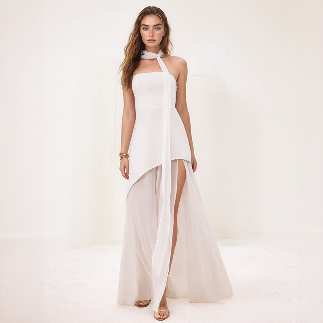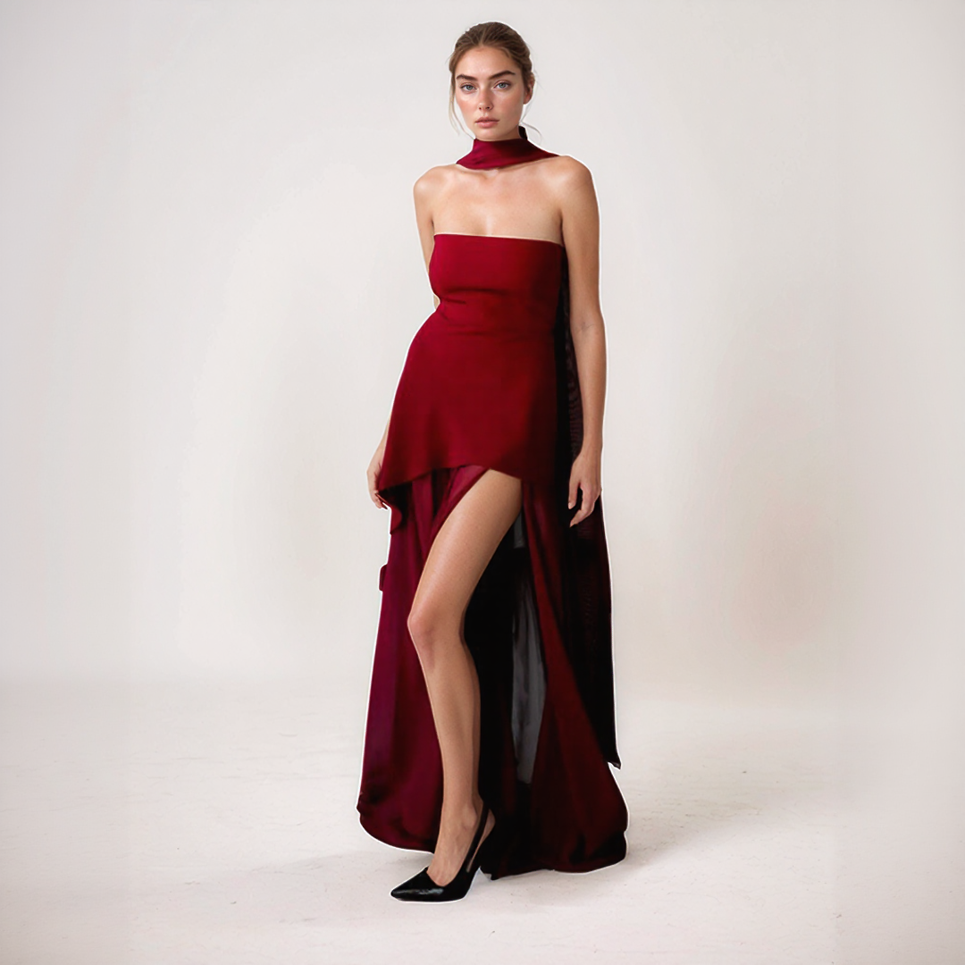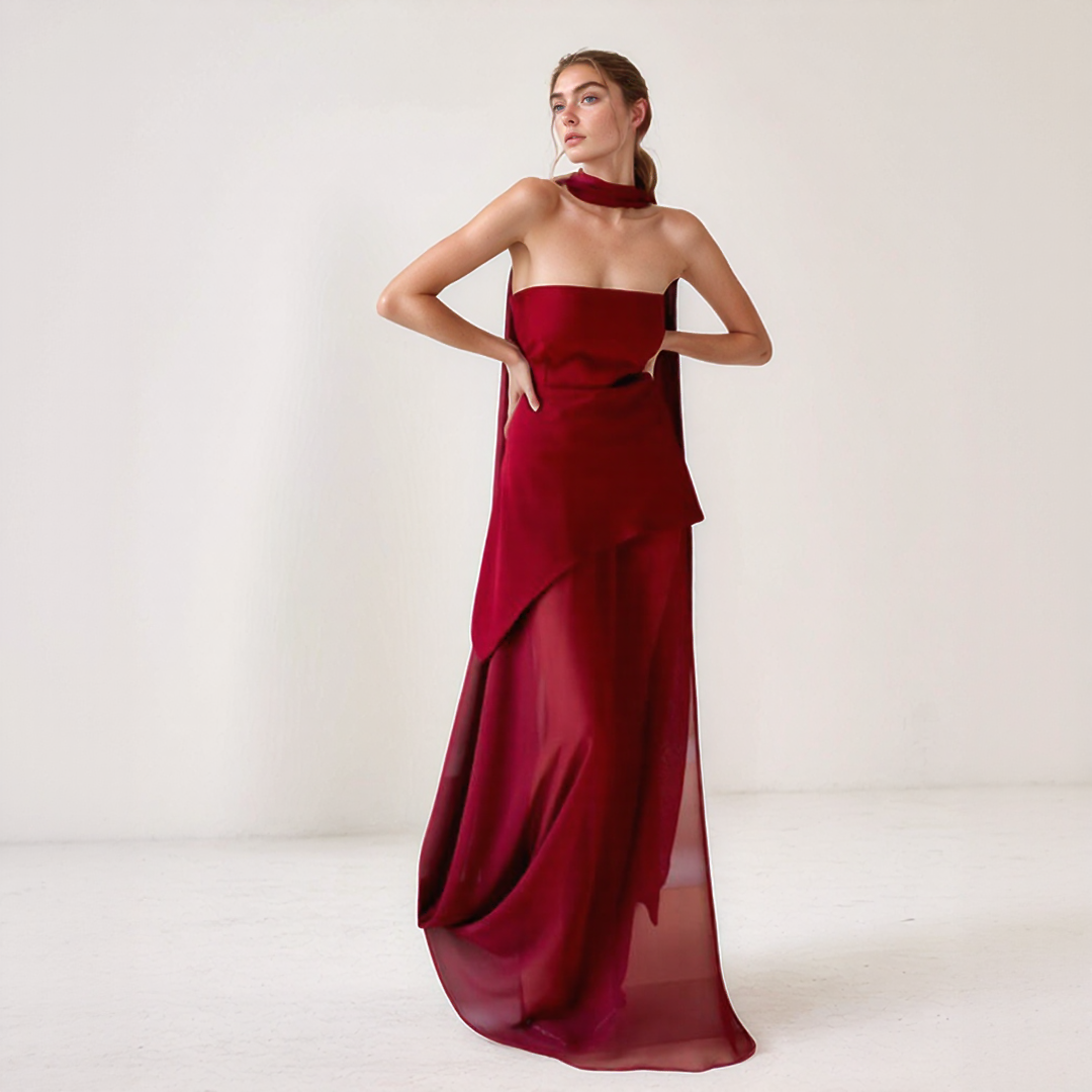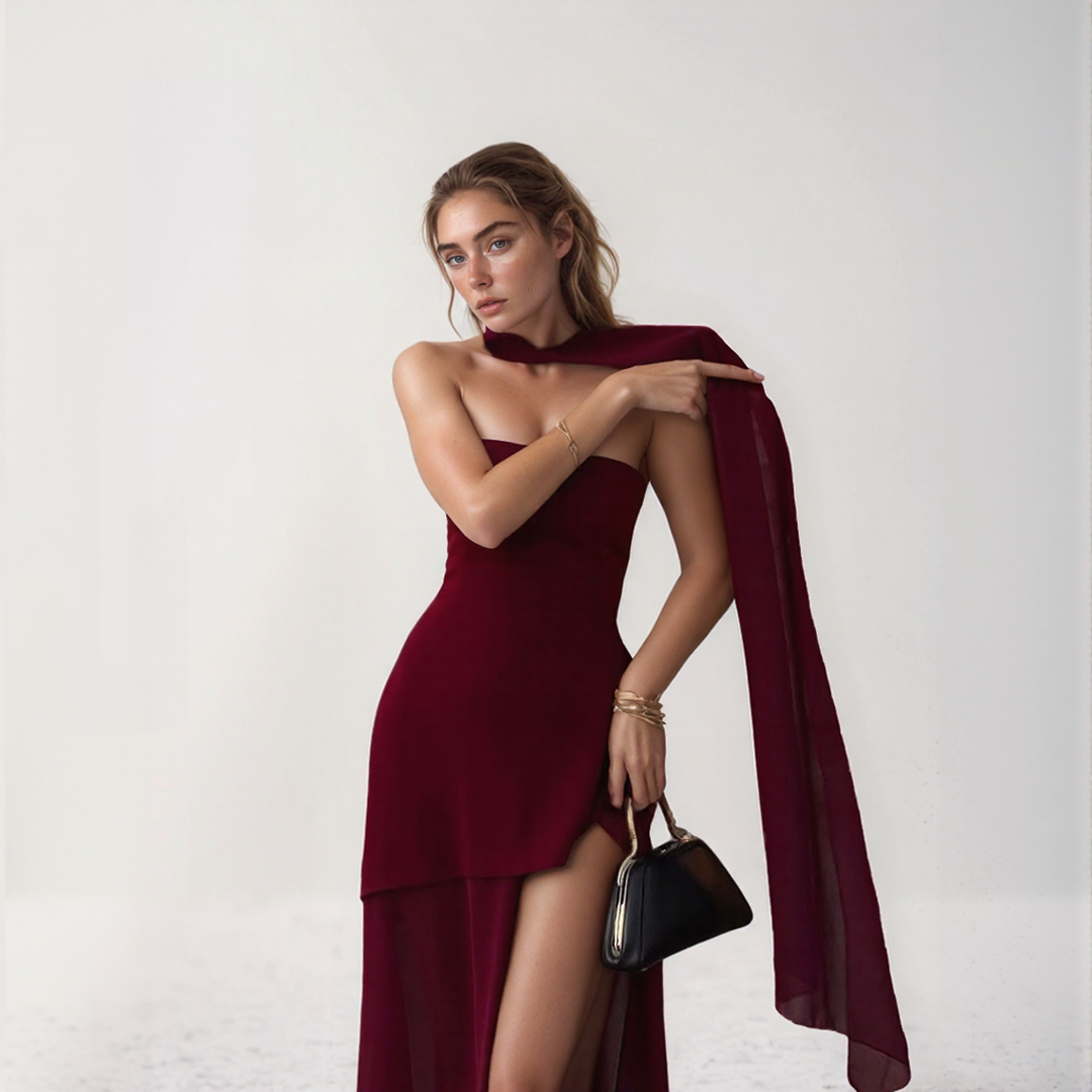 Nelly | Vestido Largo Elegante – Corte Asimétrico y Pañuelo Integrado