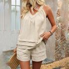Tämä hihaton V-pääntie-setti yhdistää mukavuuden ja eleganssin ilmavalla leikkauksellaan. Ihanteellinen kesäpäiville, se tarjoaa rentoa ja tyylikästä ilmettä yksinkertaisesti.