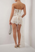 Tämä lyhyt mekko korostaa siluettia rohkealla kapenevalla leikkauksella. Sen olkaimeton muotoilu ja nauhakiinnitys selässä tuovat ainutlaatuista karakteria. Ihanteellinen iltoihin tai tapahtumiin, joissa halutaan erottua luottavaisesti.