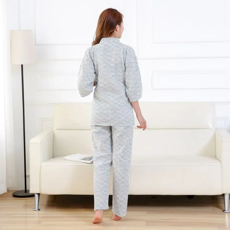 בהשראת המסורת היפנית, הפיג'מה הזו מציעה גזרה רחבה לחופש תנועה אופטימלי. הבד הרך שלה מבטיח לילות שקטים ונעימים.