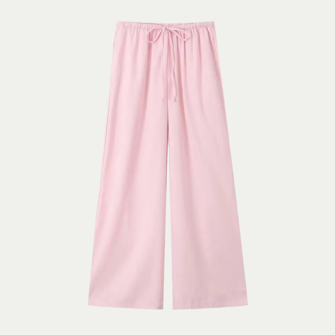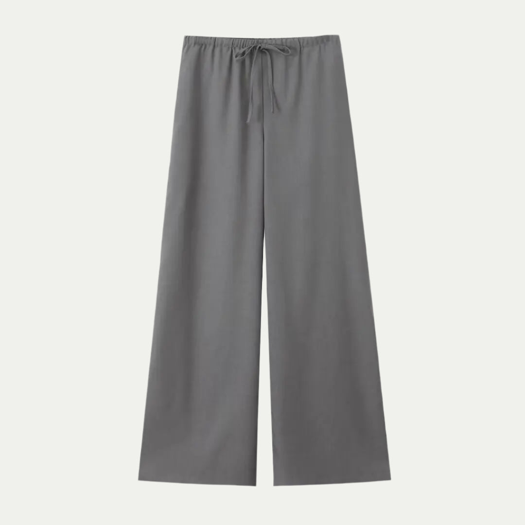• מכנסיים בגובה מותן עם רגליים רחבות לסילואט אלגנטי.