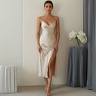 このミディ丈のスリットドレスは、流れるようなシルエットとエレガントに体を引き立てる細いストラップで魅了します。Vネックのデザインは上半身を引き立て、サイドスリットが軽やかさと女性らしさを加えます。晴れた日や夏の夜に最適で、シンプルに快適さとスタイルを兼ね備えています。