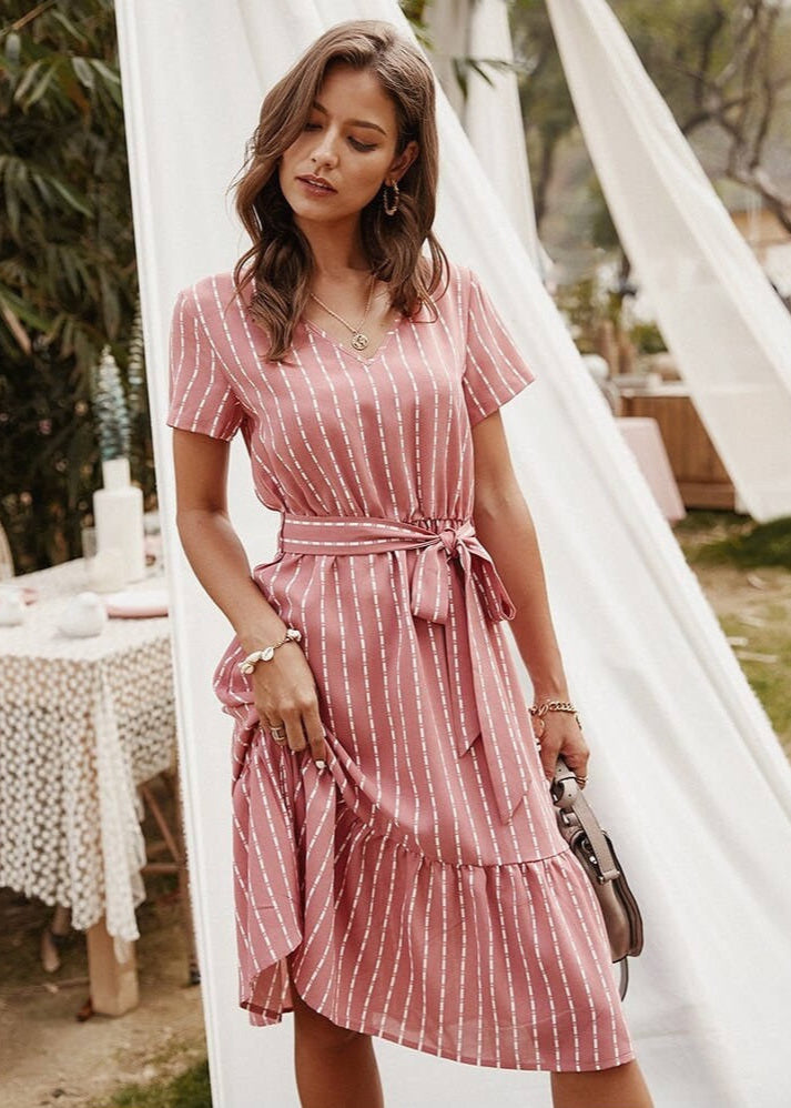 この縦縞のドレスは、流れるようなシルエットとシンプルなデザインで魅了します。Vネックと短い袖が女性らしさを加えています。夏の日やシンプルな夜に最適です。