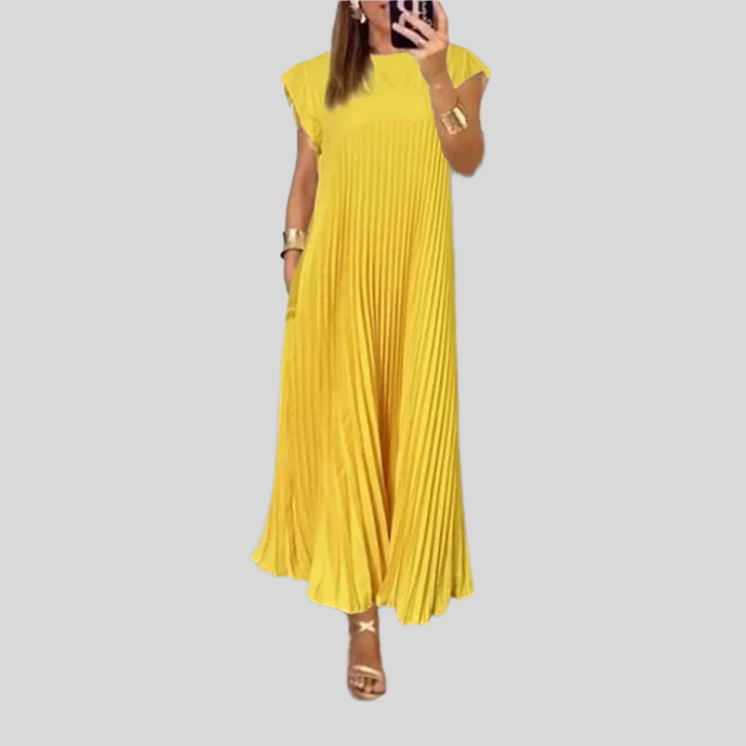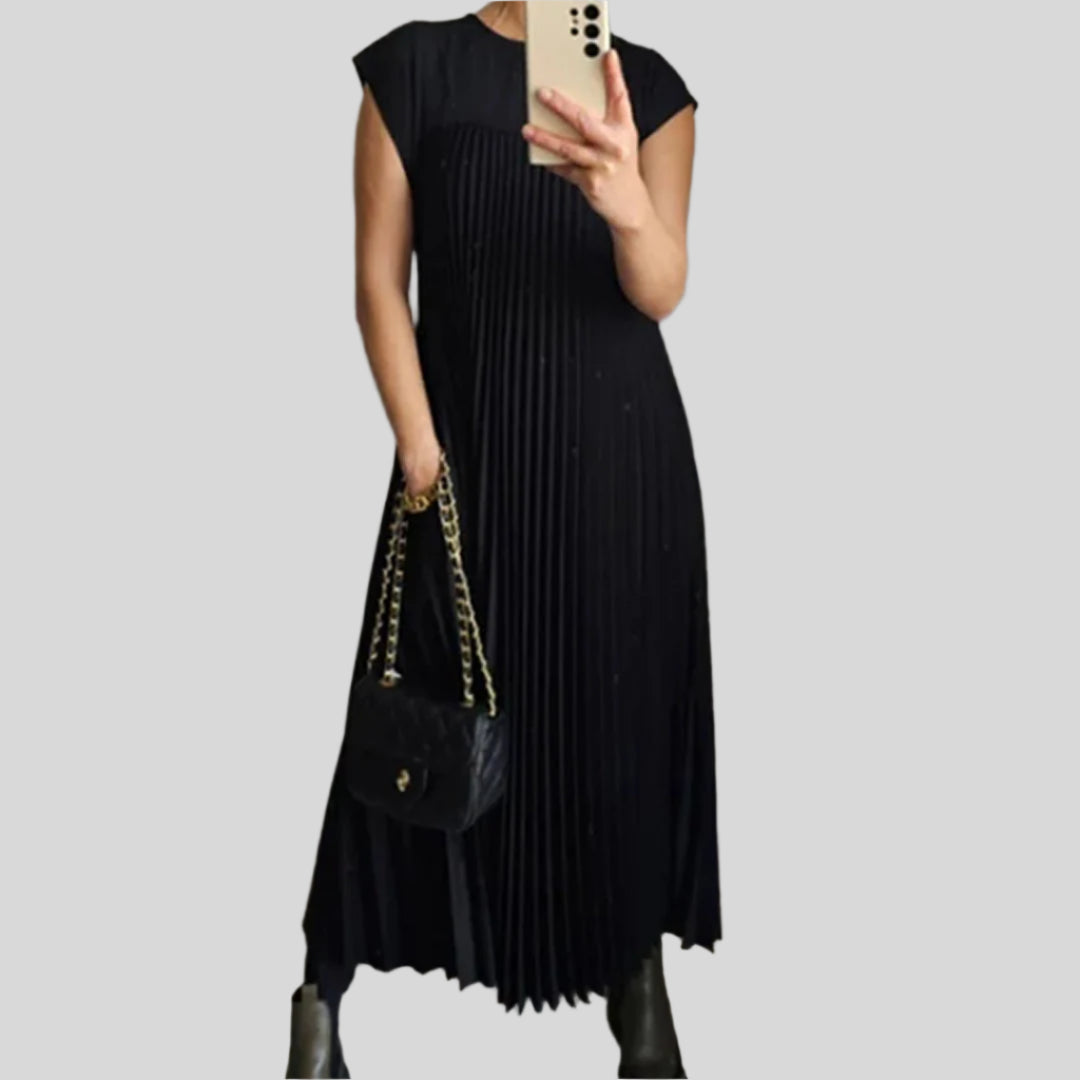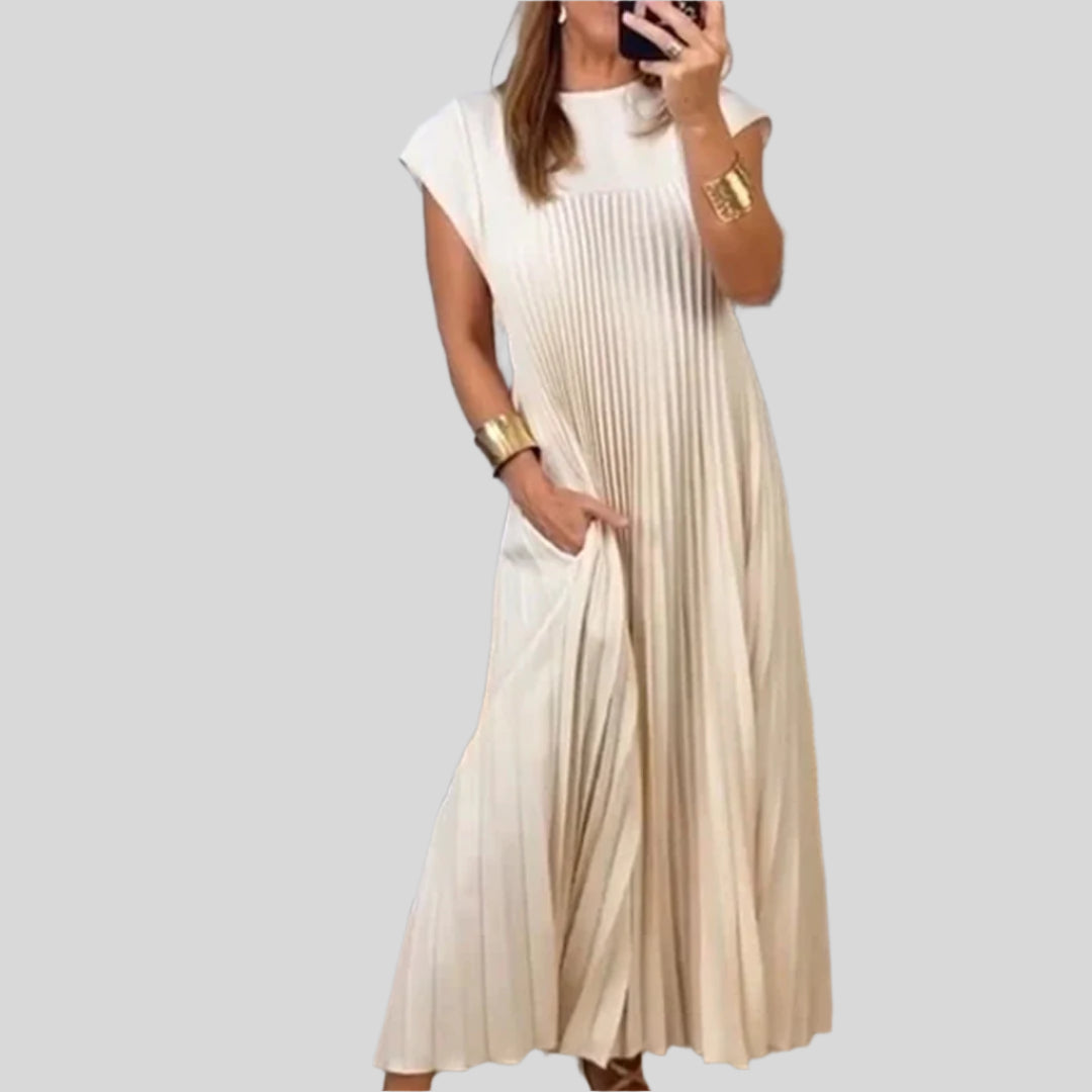 Deze geplooide jurk biedt een flatterende silhoeet. Verkrijgbaar in verschillende kleuren, past ze bij elke gelegenheid. Het tijdloze ontwerp zorgt voor een duurzame elegantie.